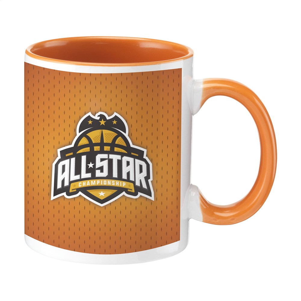 Hochwertiger Becher aus Keramik mit farbiger Innenseite. Die Farbe des großzügigen Henkels gleicht der Farbe der Innenseite, was für einen spezielen Effekt sorgt. Die perfekte Tasse für alle Drucke in Full Colour, auch Fotos. Spühlmaschinegeeignet. Fassungsvermögen 350 ml.