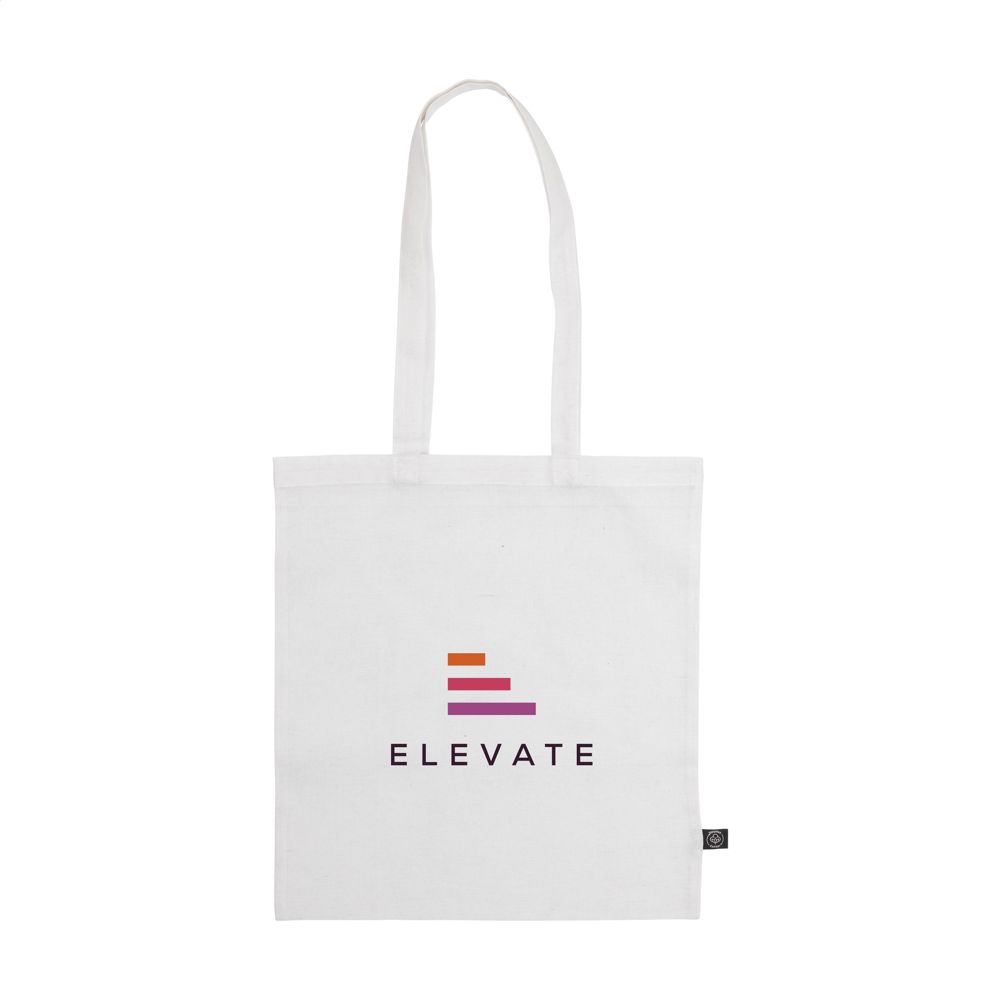 Einkaufstasche mit langen Griffen aus 80% recycelter Baumwolle und 20% recyceltem Polyester (150 g/m²). GRS-zertifiziert. Recyceltes Material insgesamt: 100%. Fassungsvermögen ca. 8 Liter.