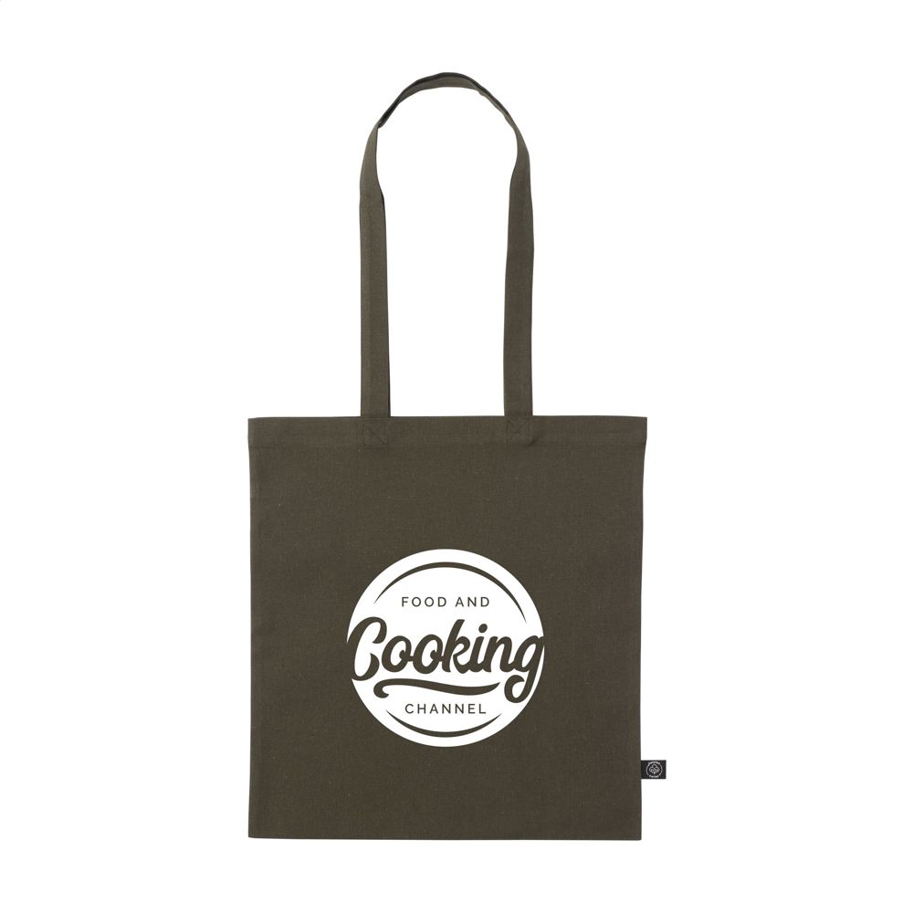 Einkaufstasche mit langen Griffen aus 80% recycelter Baumwolle und 20% recyceltem Polyester (150 g/m²). GRS-zertifiziert. Recyceltes Material insgesamt: 100%. Fassungsvermögen ca. 8 Liter.