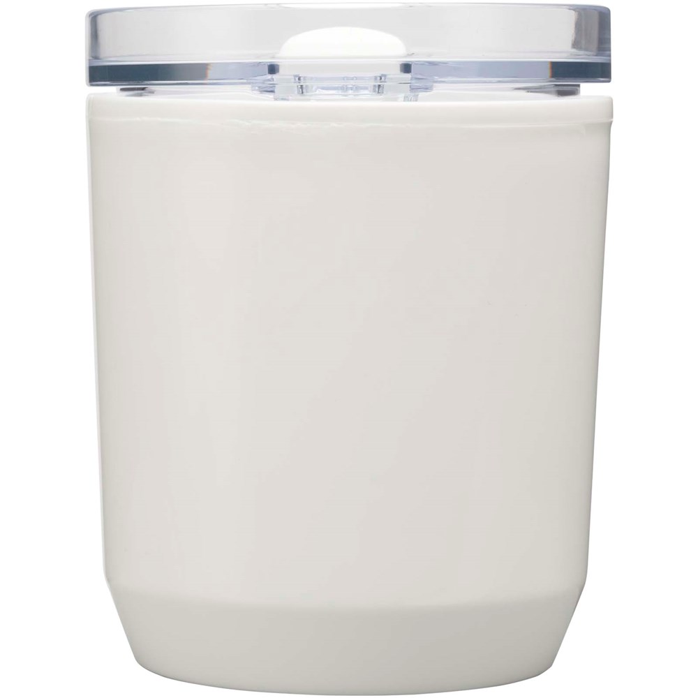 Becher mit einfachem Design, der untern die meisten Kaffeemaschinen und die meisten Getränkehalter im Auto passt. Doppelwandige Konstruktion mit einer Außenseite aus recyceltem PP Kunststoff und einer Innenseite aus PP Kunststoff. Der Schiebedeckel besteht aus AS- und PP Kunststoff. Fassungsvermögen: 180 ml.