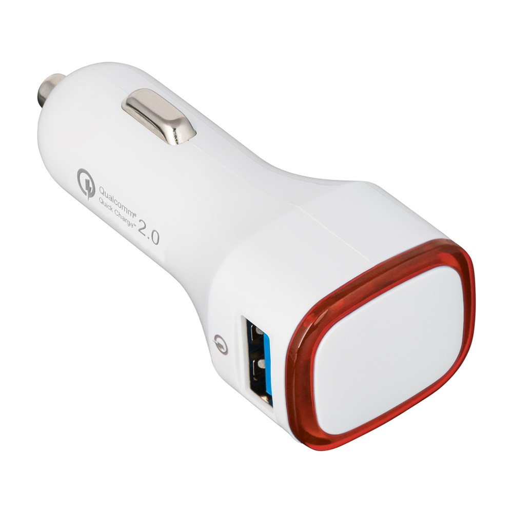Dieser Quick charge 2.0-Autoladeadapter hilft, wenn der Akku unterwegs schnell aufgeladen werden muss. Voraussetzung: Ihr Handy ist schnellaufladefähig! Wenn nicht, lädt der Adapter Ihr Gerät dennoch in Standardgeschwindigkeit auf. Output bei zwei Ausgängen - Standardausgang USB DC 5V/1,6A und Quick charge 2.0 mit bis zu DC 5V/2,4A; DC9V/1,7A; DC 12V/1,2 A in Abhängigkeit vom zu ladenden Gerät. Das integrierte Schutzsystem bewahrt vor Überspannung, Überhitzung und Kurzschluss. Der umlaufende Farbring an der Werbefläche wird per LED hinterleuchtet.
