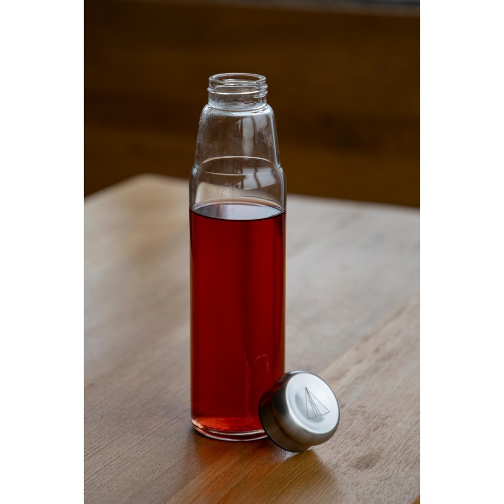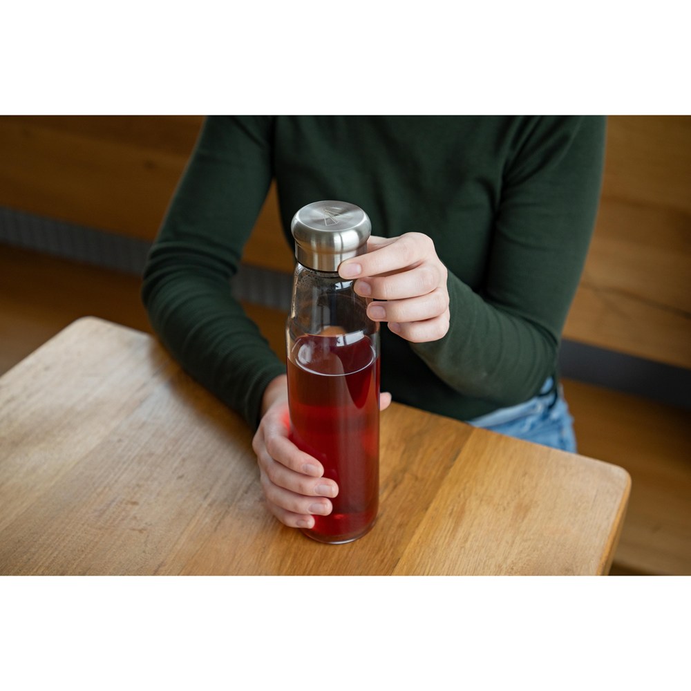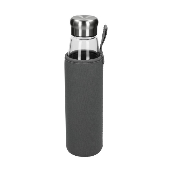 Schicke Borosilikat-Glasflasche mit Schraubverschluss aus Edelstahl inkl. Silikondichtung. Die griffige, graue Synthesekautschukhülle mit Halteschlaufe hält die Temperatur der Getränke länger konstant. Zudem schützt sie die Hände bei heißen Getränken vor dem warmen Glas. Füllmenge: 0,7 Liter.