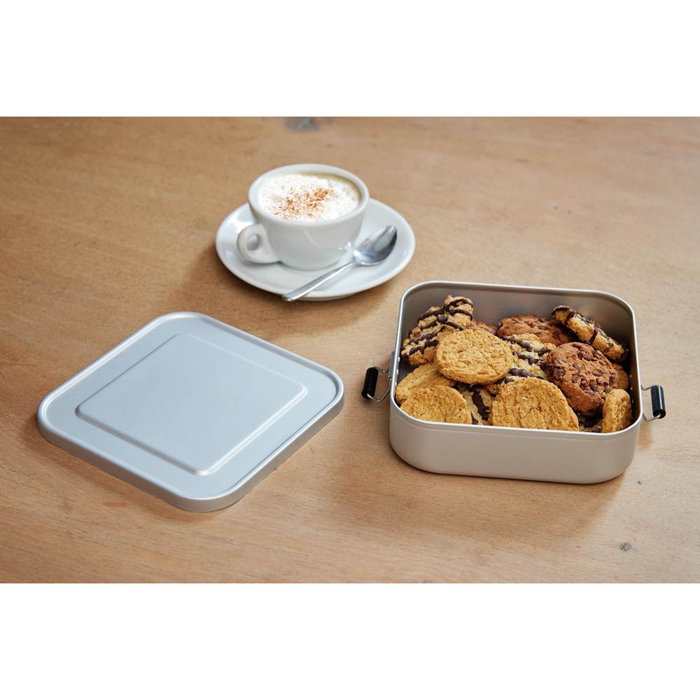 Kleine, quadartische Brotzeitbox aus Aluminium mit einer matten Oberfläche. Sicher verschließbar durch die beiden Klemmbügel. Der Deckel ist komplett abnehmbar. Nicht nur für den Einsatz auf der Baustelle geeignet.