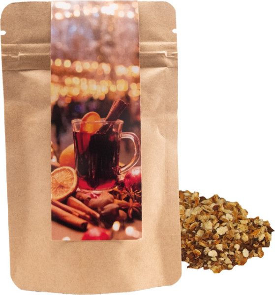 Unser Glühweingewürz mit den aromatischen Gewürzen Zimt, Zitronenschale und Nelken verleiht Ihrem heißen Getränk eine winterliche Note und versetzt Ihre Kunden in Weihnachtmarktstimmung. Nutzen Sie das Standardmotiv des Headers für Ihren Werbeeindruck ab 250 Stück. Eine eigene Gestaltung ist ebenfalls ab 250 Stück möglich.