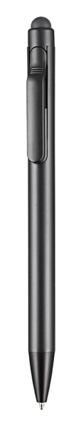 Metall-Druckkugelschreiber mit Zusatzfunktion: Weiche Gummikappe zur Bedienung von Smartphones und Tablet PCs. Farbig lackierter Aluminiumschaft und schwarze Beschlagteilen. Der Schaft eignet sich hervorragend für Lasergravuren, da das Schriftbild in edlem silber-grau erscheint. Ausgestattet mit einer blauschreibenden Metall Großraummine.