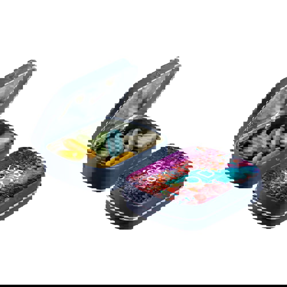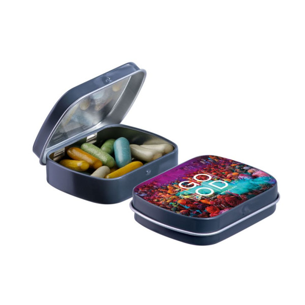 Mini dunkel grau Klappdeckeldose mit ca. 23 Gramm Lakritzstangen mix, vollfarbig bedruckt. Inklusive Inhaltsstoffaufkleber und eingeschweißt.