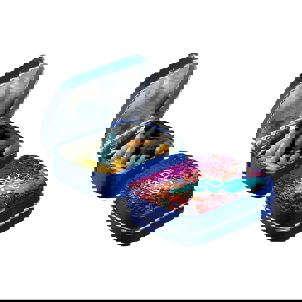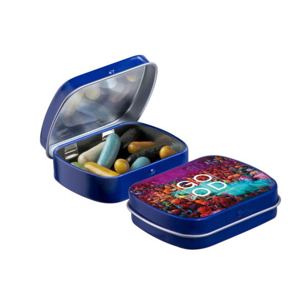 Mini blau Klappdeckeldose mit ca. 23 Gramm Lakritzstangen mix, vollfarbig bedruckt. Inklusive Inhaltsstoffaufkleber und eingeschweißt.