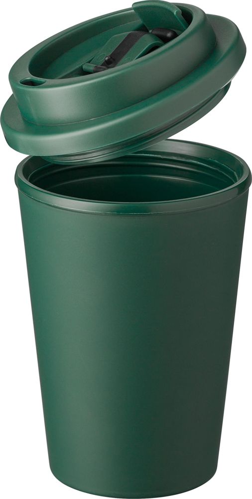 PP-To-go-Becher (350 ml) mit Schraubdeckel. Mit verschließbarer Trinköffnung. Er ist sowohl für heiße als auch für kalte Getränke geeignet.