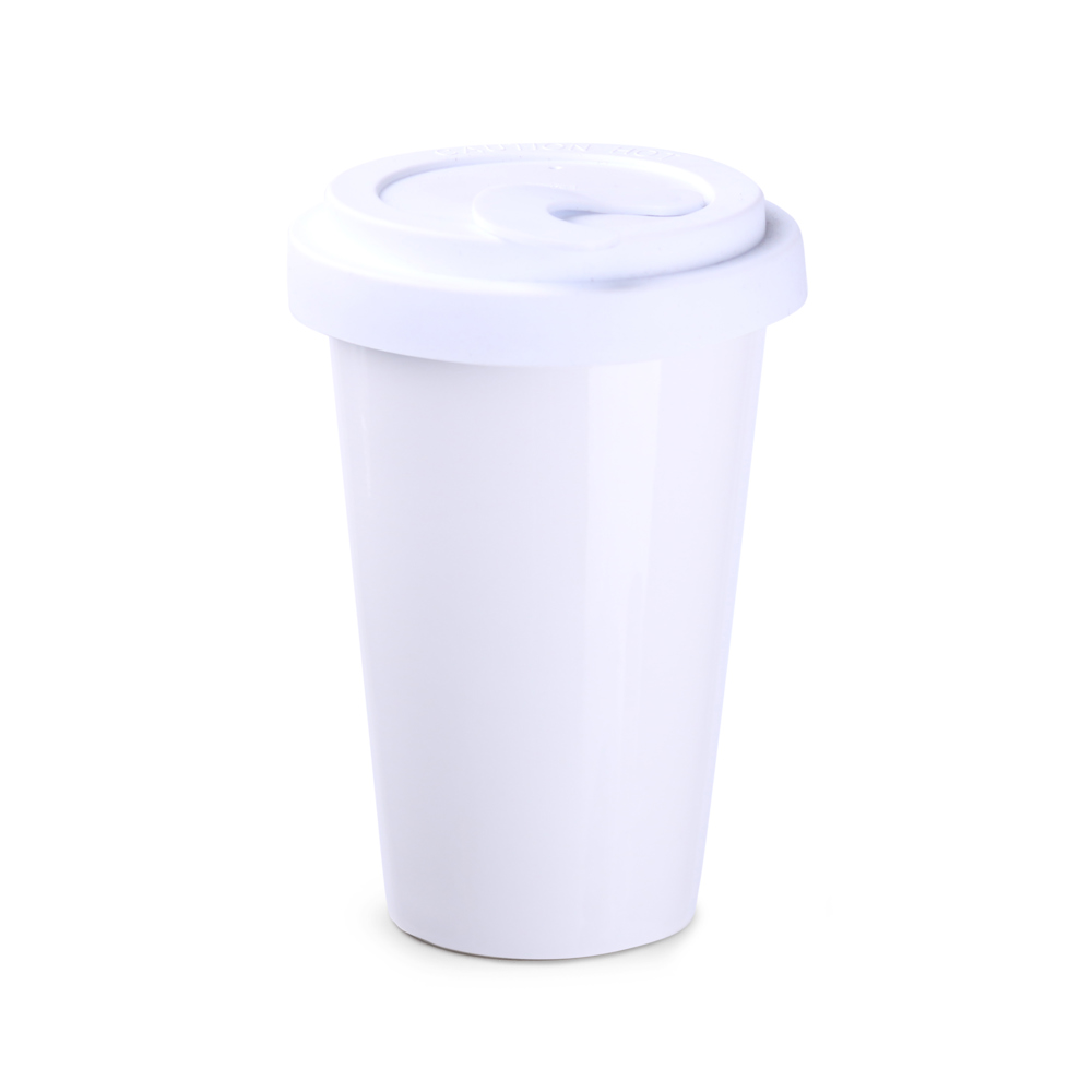 Werbebecher aus Porzellan mit einem Kunststoffdeckel und einer zusätzlichen Verschlußlasche zum Schutz vor versehentlichem Verschütten des Getränks. Das Modell ist für aktive Menschen und Liebhaber von Reisen bestimmt. Dank der seltenen inneren Struktur der doppelten Porzellanwände zeichnet sich dieser Becher durch eine erhöhte Wärmedämmung aus. Der Deckel ist in Farben erhältlich.