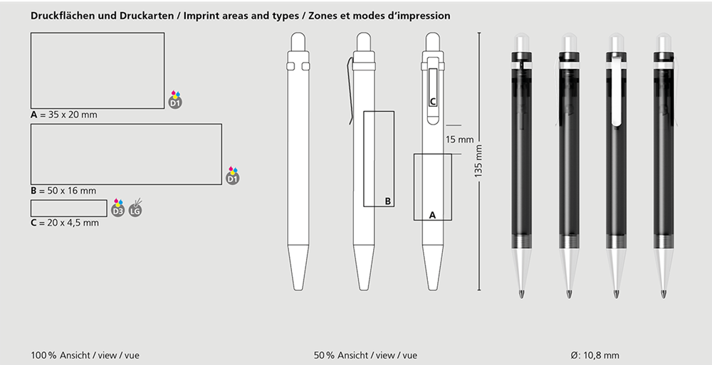 Der Icy ice PMs ist ein Druckkugelschreiber. Materialien und Oberflächen: Spitze: Kunststoff (ABS), silber lackiert. Schaft: Kunststoff (M-ABS) gefrostet. Klipp: Federstahl mattverchromt. Drücker: Kunststoff (ABS), silber lackiert. Standardfarben: Schaft: in 4 Farben erhältlich. Sonderfarben: ab 10.000 Stück, ab 25.000 Stück ohne PMS-Zuschlag. Standardmine: Icefill (2.000 m), blau, Mine optional: Silktech L.